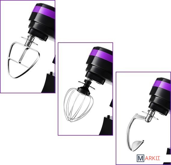 Полная комплектация - моторный блок;- чаша миксера;- крышка чаши миксера;- венчик для сбивания;- насадка для смешивания;- крюк;- руководство по эксплуатации.