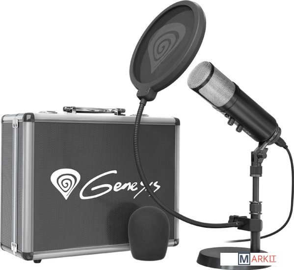 - съемная ветрозащита- поп-фильтр- кабель питания (USB Type-B - USB Type-A)- настольная подставка- металлический кейс- документация |